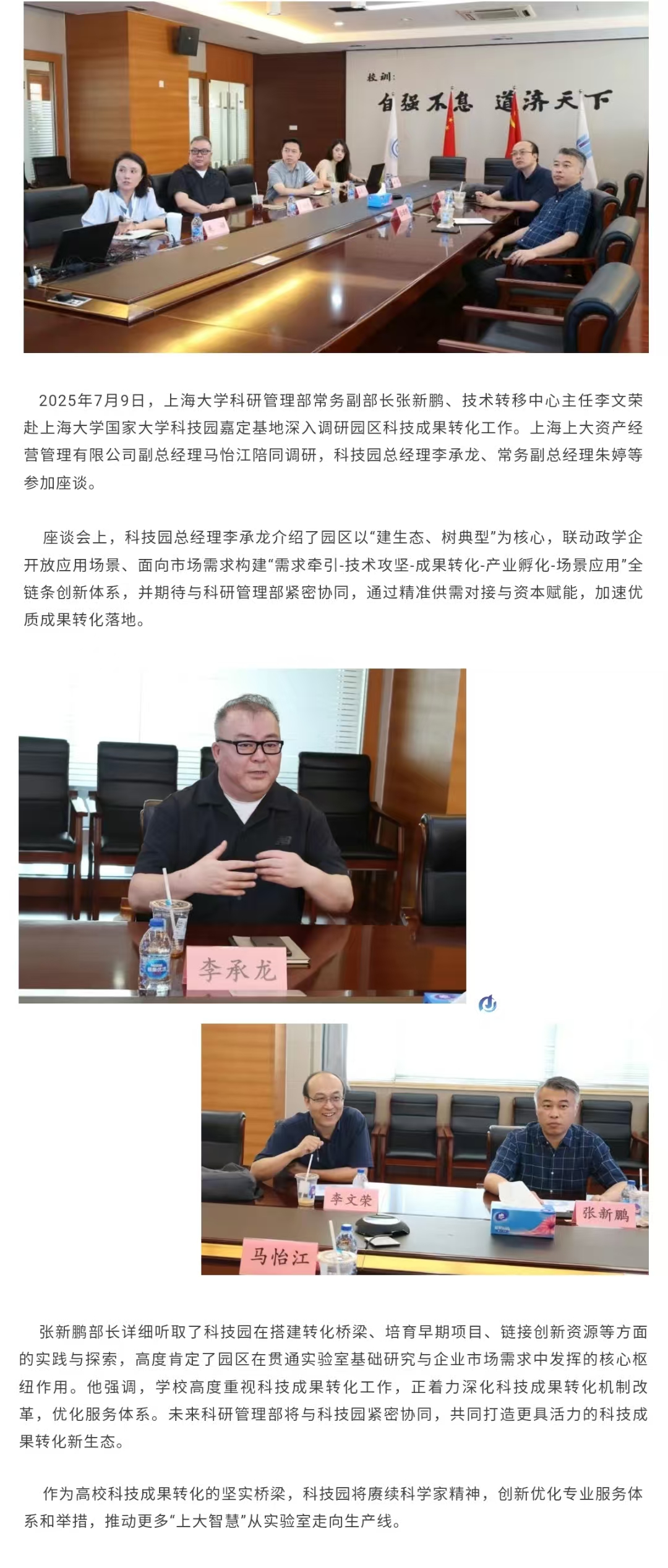 园区动态 | 上海大学科研管理部常务副部长张新鹏一行调研嘉定科技园科研成果转化工作