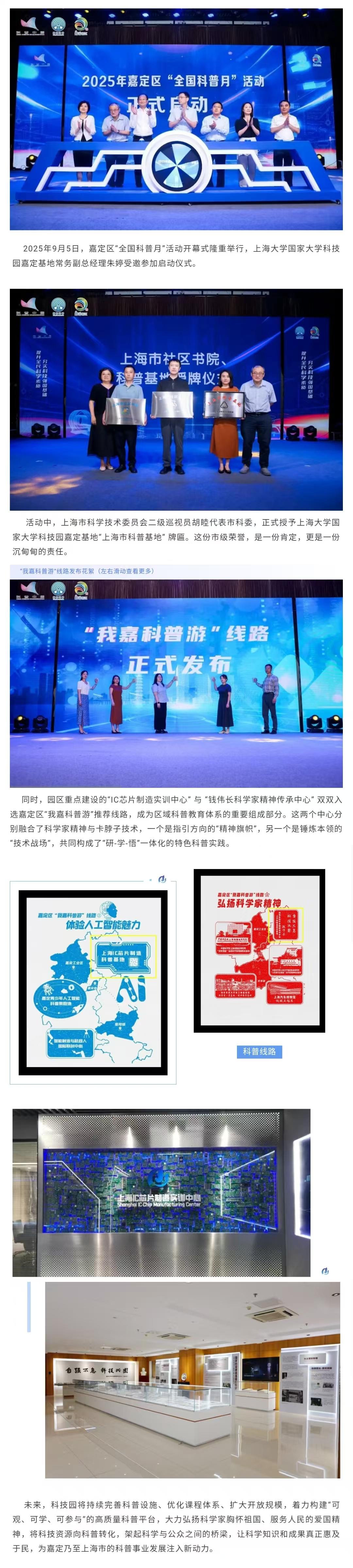 园区动态 | 园区荣膺“上海市科普基地”正式授牌,两大中心入选嘉定区“我嘉科普游”线路