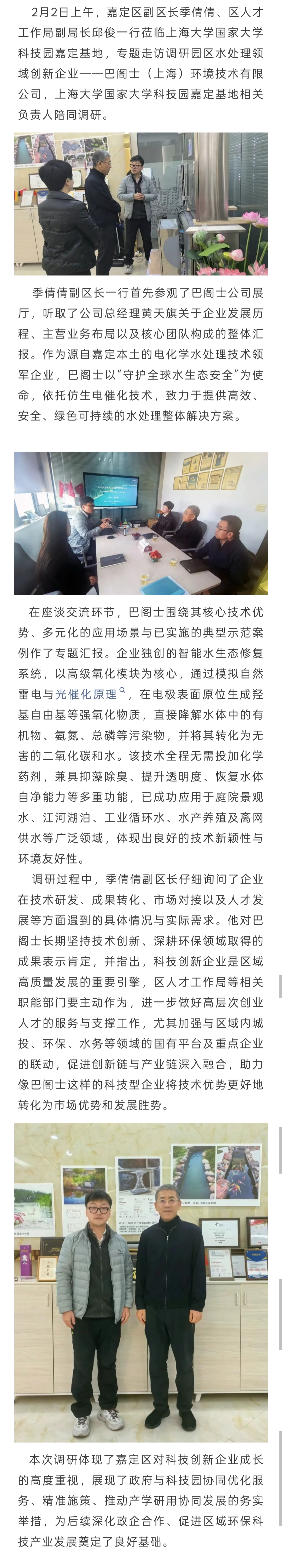 园区动态 | 嘉定区副区长季倩倩莅临科技园,专题调研园区水处理企业巴阁士